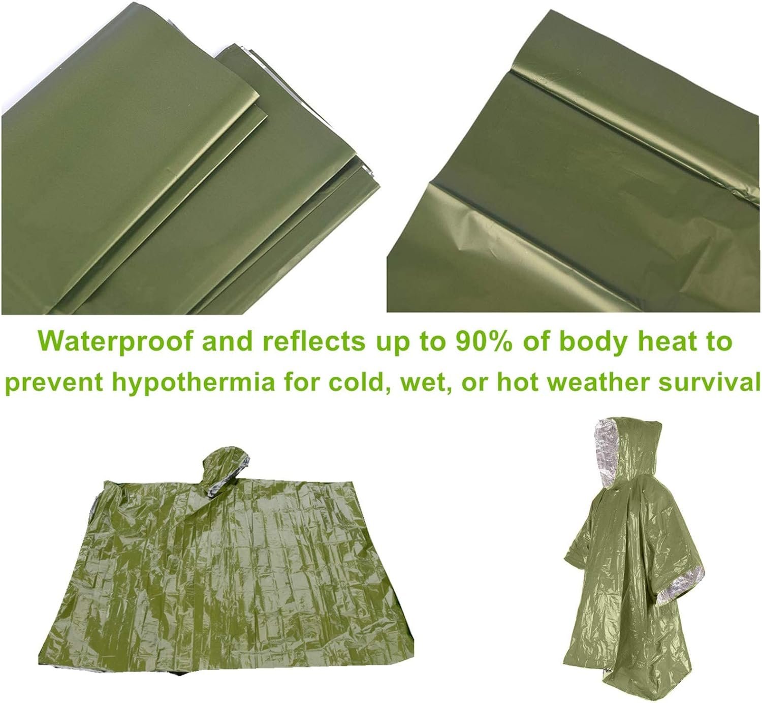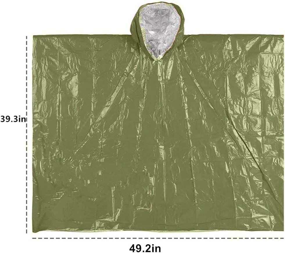 Ensemble de couverture d’urgence, poncho, couverture thermique en mylar – Poncho de pluie, équipement de survie et équipement pour activités de plein air, camping, randonnées, anneaux (vert)