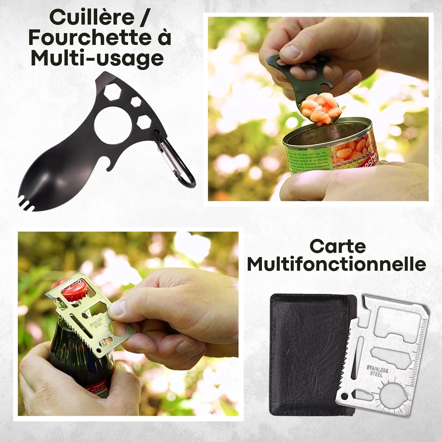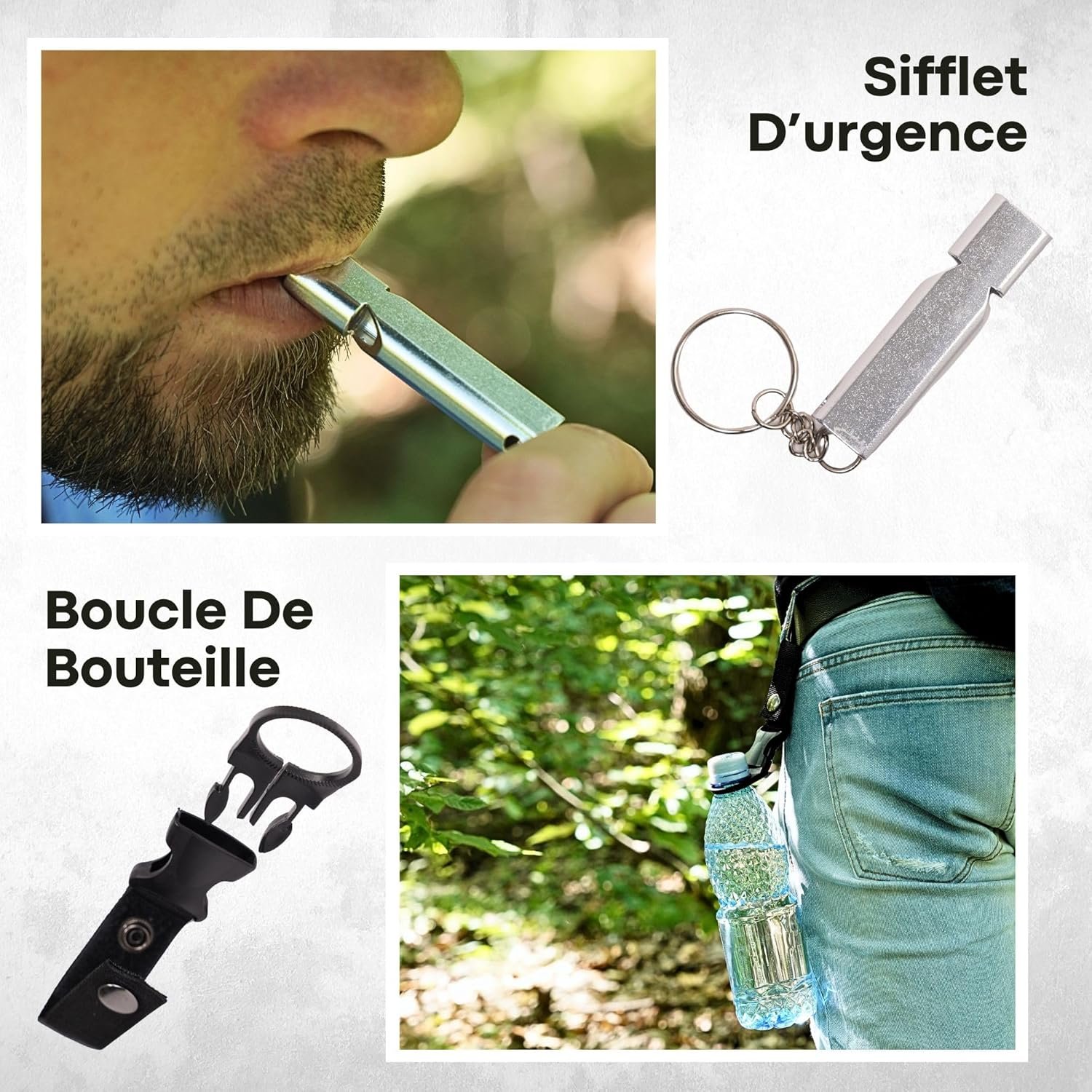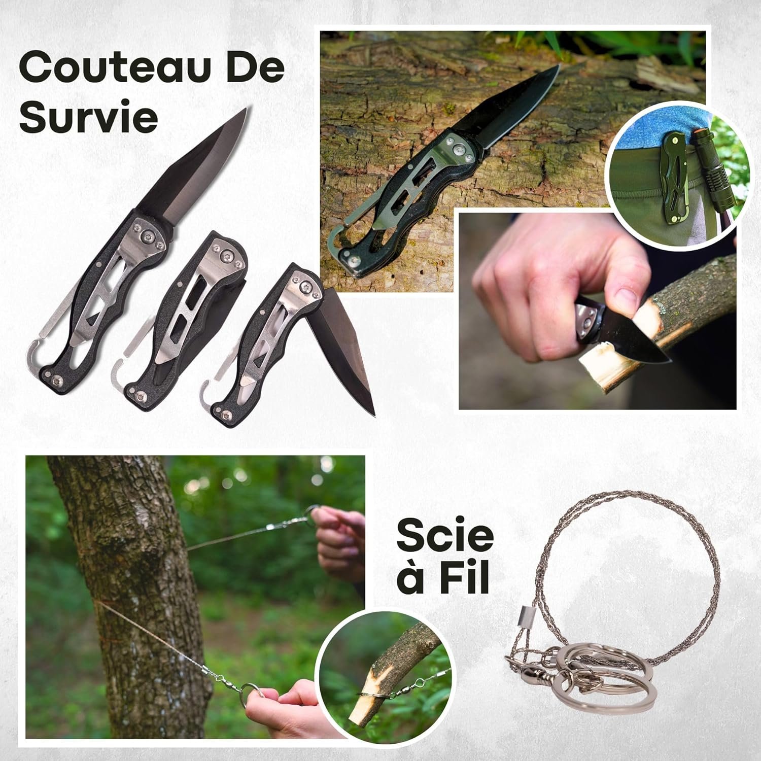 【KIT DE SURVIE COMPLET】LE KIT A AVOIR SUR SOIS pour toutes vos randonnées ou campings, le Kit contient tous les équipements INDISPONSABLES: Couteau de survie (Lame de 75mm), Boussole, Pierre à feu, Scie à fil, Lampe de poche, Bracelet de survie (5 en 1), Couverture d’urgence, Compresses stériles, Bandages, Carte multifonctionnelle, Cuillère/Fourchette, Accroche bouteille, Sifflet à double tube (en aluminium peut atteindre 120 db), Tournevis cruciforme et plat, Mousqueton, Lumière LED pour S.O.S, Boîte étanche.