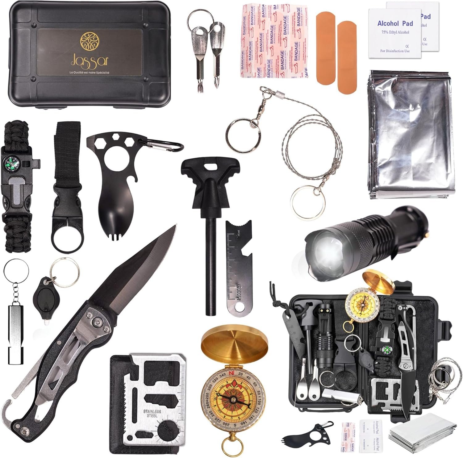 Jassar| Kit de Survie Complet Randonnée Camping + Couteau + Boussole + Couverture + Pierre a Feu + Outils Accessoire Matériel Militaire Compresses Stériles Gadget Paracorde Sac Edc