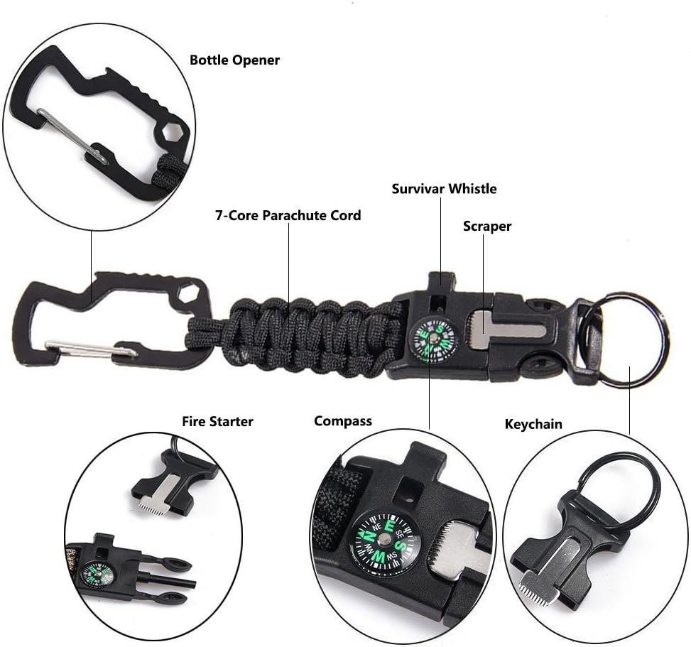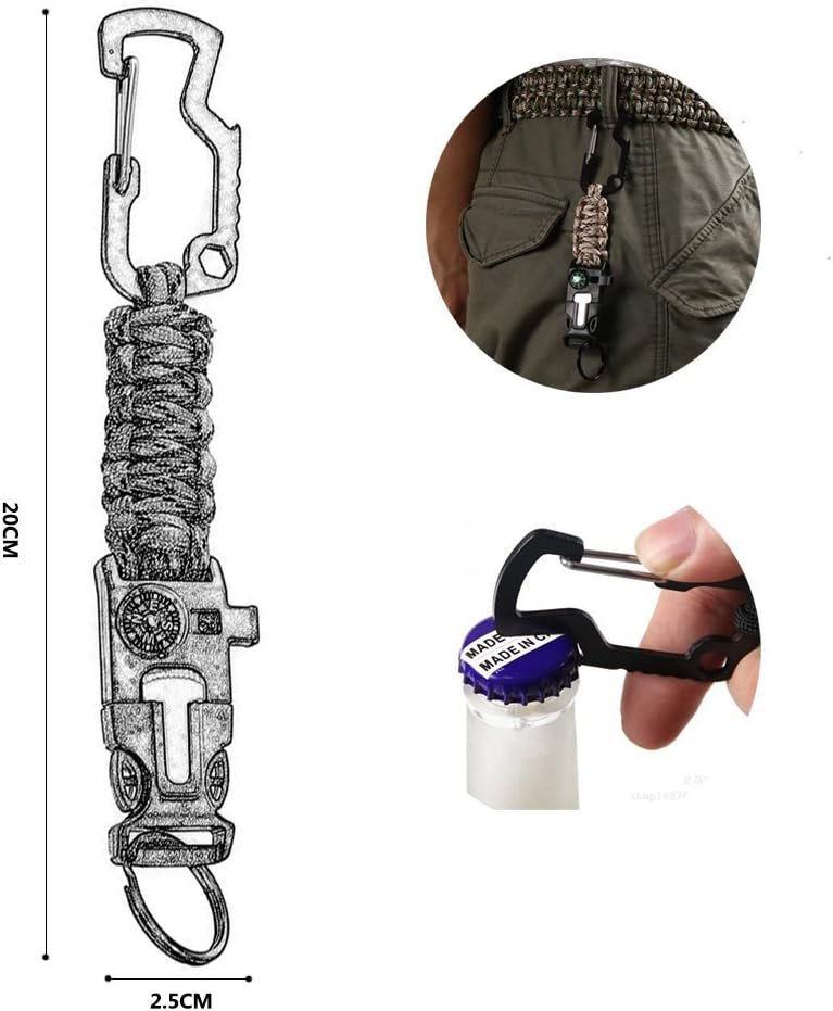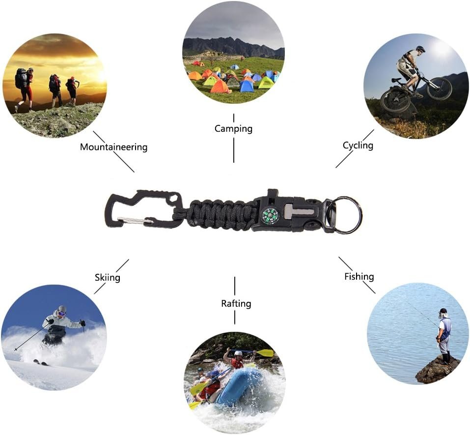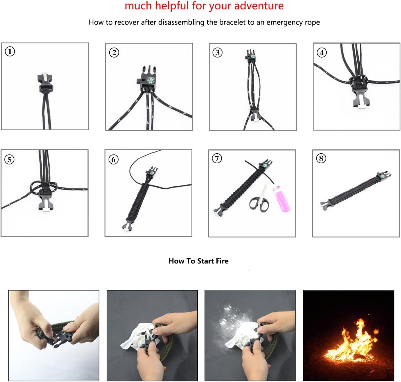 Outils de Survie Tout-en-un: Le bracelet contient 8 sortes d’outils tels que porte-clés, démarreur de feu de silex (tige de magnésium), grattoir de feu, sifflet, corde de parachute, boussole, mousqueton, décapsuleur. Avec ces kits, vous pouvez toujours être prêt pour toutes sortes d’aventures en pleine nature et en plein air